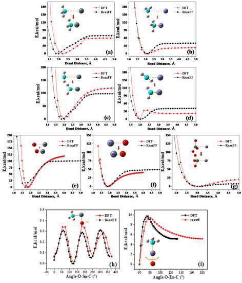The ground state structure (such as multiple molecular structures in Figure 1) is provided for verification by identifying, constructing, and optimizing specific systems. It is strictly described by quantum chemistry (QM). Finally, by limiting the calculation times to DFT/ReaxFF, the bond length or the selected angle is limited to the range below and above the equilibrium value. The dissociation curve is constructed for the structure. The ability of metal atoms to achieve a high coordination state is related to the strong differentiation of catalysts, so it is essential to characterize the ability of metals to bind multiple carbon groups alone. For Zn and Sn metals, the singlet is built by adding carbon groups to determine the lowest energy spin state of the system, as shown in Figure 1a–d, which facilitates more accurate energy determination and reduces the cost of calculation. Figure 1 represents the interaction energy between different groups and metal atoms, which compares the bond length and bond angle energy difference calculated by the ReaxFF with the energy difference calculated based on the first principle, which is used to proofread and verify the accuracy of the force field. As shown in Figure 1, The C–Sn equilibrium bond lengths calculated by QM are closer to the results of Bernt et al. (2.108–2.146 Å) [33]. On the QM energy spectrum, when the C–Sn bond extends above 3.41 Å, the energy state of the DFT data changes, which ReaxFF well captures by calculating the lowest energy state.