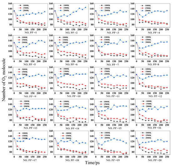 The evolutions of the O2 number during the PP combustions at different temperatures are shown in Figure 2. It can be seen that the O2 consumption of combustion systems with various PP percentages is comparable. The higher the combustion temperature, the slower the rate of O2 consumption, and the smaller the total amount of O2 used. For 20 PP/ZS composites, O2 consumption was around 38.5% when the combustion temperature was 1000 K. During the first 10 ps of rapid O2 consumption, the combustion rate was 1.21 to 1.76 O2 molecules per picosecond. At 150 ps, the O2 concentration stabilizes. The O2 consumption of twenty distinct PP/ZS composites varies as well. When there are thirteen or more PP clusters in PP/ZS composites, the total O2 consumption increases dramatically and gradually exceeds 50 O2 molecules.