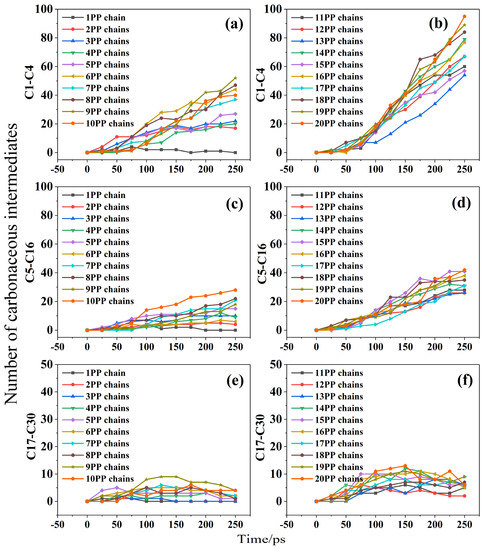 Moreover, the generation time of C5–C16 is earlier than that of C1–C4, and the number of generated fragments is greater. Figure 4e,f shows the changes in intermediates containing C17–C30. It can be seen that when the content of PP is 4/8/16–24/32/64/76/80%, the composite will not crack into C17–C30 intermediates and the occurrence time of such intermediaries is 70 ps. Figure 4e shows that the generation time of C17–C30 mediators is the earliest in the PP = 36% system, followed by the PP = 12%/68% system. According to Figure 4f, the C17–C30 intermediate of the PP = 18 system appeared after 150 ps, reached the maximum value at 250 ps, and cleaved into four C17–C30 fragments, followed by PP = 68% system, with a maximum of three cleaved fragments.