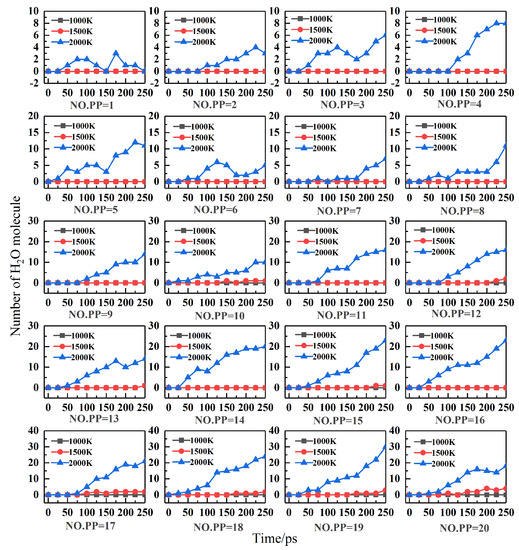 Figure 6 shows the evolutions of H2O molecules with time in the combustion for 20 PP/ZS composites at different temperatures. When the temperature exceeds 1000 K, water molecules can be formed. Moreover, the number of water molecules is also increasing with the increase of PP content in the composites. The time of water molecules formed in the system is before 100 ps, and the occurrence time is independent of PP contents in composites. When the PP content is 4–16%, the number of water molecules generated by combustion is less than 10. When the PP is 20–52%, H2O molecules are fewer than 20 in combustion.