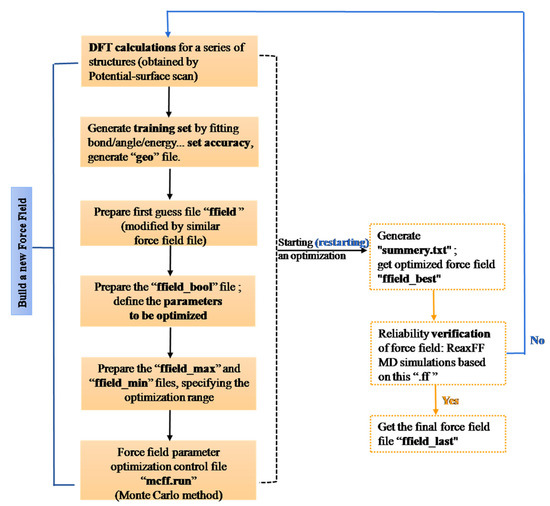 When the reasonable model of the training set is determined, these molecular structures are calculated by single point energy calculation, geometric optimization, and PES scanning, and then the force field parameters are fitted from the calculated results of these training sets [40,45,46]. These calculations are based on the first principles of the density functional theory (DFT) framework. DFT calculations use the B3LYP method and mixed basis sets (C/H/O element of 6-31G* and Zn/Sn of SDD pseudo-potential) [47,48,49]. Molecular structure DFT calculations were performed using the Gaussian16 [47]. The crystal structure with periodic boundary conditions is calculated using the Band module of the AMS code [40]. The findings are adapted to the new training set using the AMS and its suggested standard processes and methodologies. By optimizing the balanced training sets, the weight distribution is moderately changed to guarantee that the weight is increasingly skewed towards the combustion conditions of the PP structure (the process is shown in Figure 8).