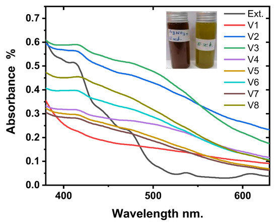 When compared to the pure extract, Figure 1 shows the confirmation of the formation of silver nanoparticles. The formation of Ag-NPs was monitored in UV-Vis absorption spectra after different volumes of AgNO3, ranging from 20 mL to 80 mL, were added to a 20 mL HME. The absorbance peaks were shifted to a red wavelength and ranged from 414 nm to 418 nm. This indicates that the mean diameter of Ag-NPs has increased [57,58,59]. The sample V3, which had a volume ratio of 20 mL to 40 mL of reactants, had the highest absorption. This was the optimal volume ratio for the biosynthesis of Ag-NPs that was determined.