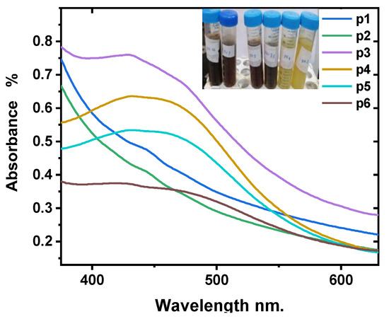 Figure 2 demonstrates the effect of pH on the formation of Ag-NPs. It is clear that when changing pH from 3 to 10, the UV-Vis absorbance peak increases and then decreases. The best absorption is for sample p3, pH = 7.5, and this means the probability of silver nanoparticle formation increases in the neutral reaction medium. As well as the absorption peak, which is related to the size and shape of the formed Ag-NPs, the role of the pH factor is to increase and alter the electrical charges of biomolecules, which in turn affect the capping, stability, and growth of Ag-NPs [56,60]. This study demonstrated that the prediction of Ag-NPs formation in the basic bio-reaction is greater than that in the acidic bio-reaction.