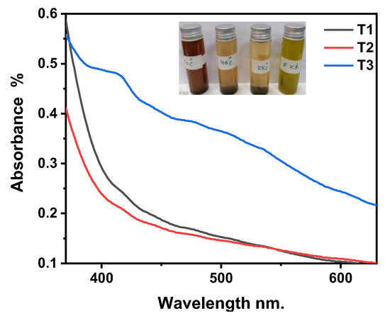 From Figure 3, it is shown that the highest temperature has the highest absorbance. This set of experiments proposes that the high reaction temperature of Ag-NPs biosynthesis will accelerate the formation and growth of Ag-NPs more than at room temperature. This can be explained by the acceleration of the Ag+ reduction rate and then the regular nucleation of silver seed [32,61,62]. The maximum absorbance at high temperatures in sample T3 indicates that the Ag-NPs are smaller due to their formation at shorter wavelengths than at low temperatures.