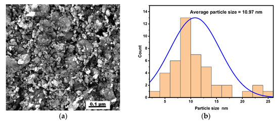 In Figure 5, the SEM micrograph illustrates the silver nanoparticles with their white color and small spherical particles. It was also clear from the SEM image that the capping agent provided stabilization for silver nanoparticles, caused them to spread out within the aggregates, and prevented them from gathering [70]. The size of these particles was calculated using ImageJ software, and their size distribution is shown in Figure 5b, with an average particle size of 10.97 nm. This value of average particle size is approximately similar to the value of crystal size of these silver nanoparticles from XRD analysis.