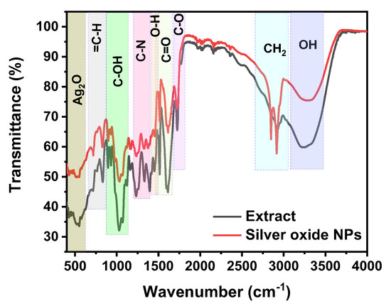 In the fingerprint part of the IR spectrum, the peak assignment at 520 cm−1 is attributed to Ag-O stretch vibration groups, and this value is in good agreement with reported research [71,74]. The other absorption peaks that correspond to the functional groups that are available in the HME solution and contributed to the capping of the silver and silver oxide nanoparticles are shown in Table 1.