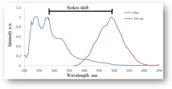 From Figure 7, the HME solution showed an emission spectrum with a peak at 493 nm and an absorption spectrum with peaks at 243 and 277 nm. These peaks are due to spin-allowed S0 → S2 electronic transitions. Two additional but lower intensity peaks are also observed at 329 nm and 416 nm for the absorption spectra, which indicate an S0 → S1 type electron transition that is spin-allowed [86]. A high Stokes shift between the absorption and emission spectra of about 216 nm is observed for the product solution (HME and Ag nanoparticles), which indicates a large increase in the dipole moment and an energy transfer through non-radiative processes, as shown in Figure 7. The spectra show that there are a variety of functional groups that can bind to metallic elements to create nanoparticles, as undertaken in this study [87,88,89,90].