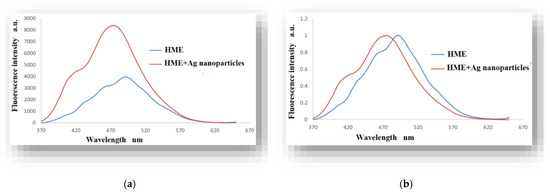 It was found to be a 100% increase in the fluorescence intensity in the product solution (HME and Ag nanoparticles) compared to the pure HME solution, as in Figure 8a. Additionally, a hypochromic shift in the emission maximum spectra of the HME solution of about 20 nm is observed as a result of the presence of silver nanoparticles compared with the pure HgME solution, as in Figure 8b.