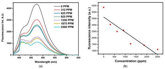 From Figure 9, it is clear that the intensity of fluorescence decreases with the increase in the concentration of mercury ions, and this indicates the existence of an electrostatic interaction between mercury ions and silver nanoparticles, as mentioned in previous research. The potential reaction mechanism depends on the oxidation of mercury ions to the capping (hydroxyl) of the silver nanoparticles. This leads to the transformation of mercury ions into mercury particles (surrounded by hydroxyl). Next, a part of the mercury ions interacts with silver ions and turns into a silver–mercury molecule, and then gradually, the silver nanoparticles turn into normal silver particles, and the concentration of the fluorescence intensity of the product decreases [23,49,91].