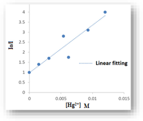 Figure 10 shows the Stern–Volmer plot derived from the following equation of silver nanoparticle fluorescence quenching using Hg2+ as a quencher [92]: