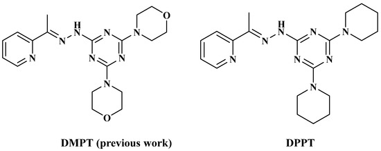 Structure of (E)-2,4-di(piperidin-1-yl)-6-(2-(1-(pyridin-2-yl)ethylidene) hydrazinyl)-1,3,5-triazine (DPPT) and its previously published analogue (DMPT) [36,37].