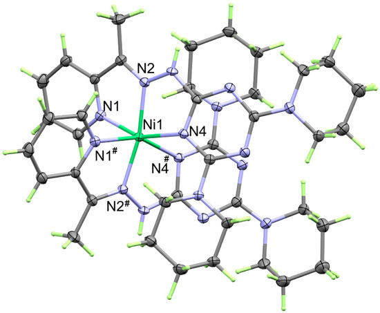The structure of the homoleptic complex, [Ni(DPPT)2](NO3)2*1.5H2O (1), was confirmed using single-crystal X-ray diffraction. It crystallized in the monoclinic crystal system and C2/c as a space group. The asymmetric formula of complex 1 contains half of the formula above. In the unit cell, there are two [Ni(DPPT)2](NO3)2*1.5H2O formulas, and the unit cell volume is 4517.8(2) Å3 while the calculated density is 1.427 Mg/m3. The presentation of the coordination sphere of complex 1 is shown in Figure 2.