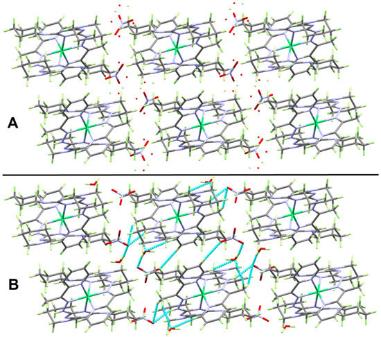 Packing views of complex 1 along b directions showing the disordered nitrate counter ion and the crystal water molecule interpenetrating the cationic complex unit (A) and connecting the [Ni(DPPT)2]2+ units via C-H…O and N-H…O (B) interactions (Table 2).