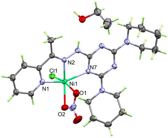 The structure of the heteroleptic complex 2 was found to be [Ni(DPPT)(NO3)Cl].EtOH, which represents the asymmetric unit of 2 (Figure 4). This complex crystallized in the less symmetric triclinic crystal system and P-1 space group. In the unit cell, there are two molecules of the asymmetric formula [Ni(DPPT)(NO3)Cl].EtOH and its volume is 1282.43(4) Å3, while the calculated density is 1.509 Mg/m3.
