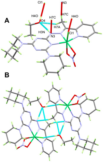The supramolecular structure of this complex is controlled by a number of hydrogen bonding interactions, including the N-H…O, C-H…O, C-H…N and O-H…Cl interactions listed in Table 4, while the presentation of the most important contacts is shown in Figure 5A. The N3-H3N…O4 H-bond occurs between the N3-H3 group of the hydrazone moiety as a H-bond donor with an O4 atom of ethanol as a H-bond acceptor. The C7-H7A…O4 and C7-H7C…N3 interactions occurred between the C-H bond from the methyl group as a H-bond donor with the O4 and N3 atoms of the OH and NH groups as a H-bond acceptor. In addition, the coordinated chloride participated in the molecular packing via the formation of an O4-H4O…Cl1 hydrogen bond. These non-covalent interactions connect the complex units leading to the hydrogen-bonded dinuclear formula shown in Figure 5B.