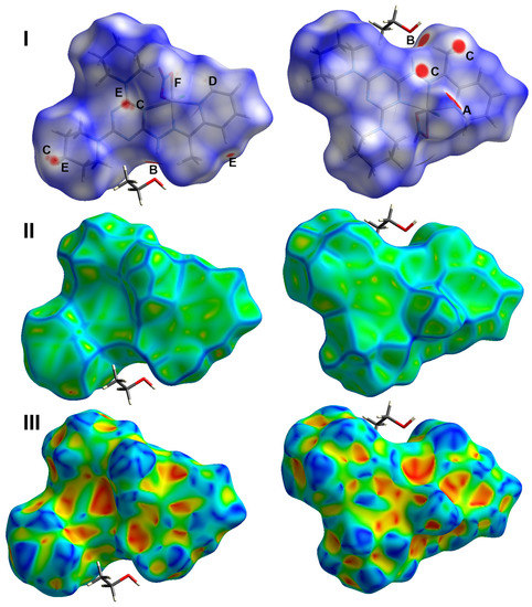 Similarly, the Hirshfeld surfaces of 1 are shown in Figure 8, where the decomposition of the fingerprint plot revealed the importance of the H…H and O…H contacts in the molecular packing. A summary of these short interactions is given in Table 6.