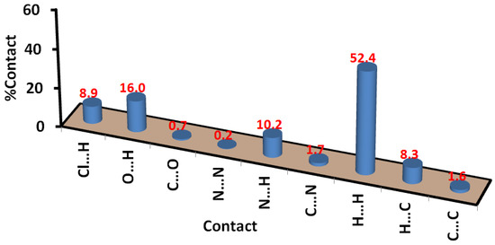 Analysis of the fingerprint plots not only gave a quantitative summary of all possible intermolecular contacts but also shed light on the importance of these interactions on the molecular packing. All Cl…H, O…H, N…H, H…H, C…H and C…C contacts have clear, sharp spikes in the corresponding fingerprint plots (Figure S1, Supplementary Materials). The presence of these sharp spikes reveals that some of these contacts occurred at distances shorter than the van der Waals radii sum of the atoms sharing this contact. The pattern of the fingerprint plot for the N…H and C…H interactions indicated that the surface acts as both a hydrogen bond donor and hydrogen bond acceptor. On the other hand, the surface acts mainly as a hydrogen bond acceptor with respect to the Cl…H interactions. In contrast, the surface is the hydrogen bond donor for the most important O…H interactions.