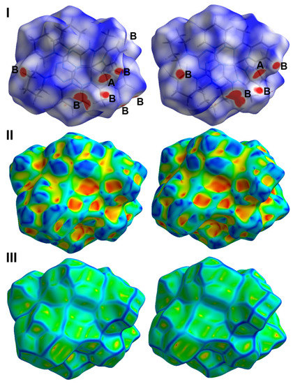 Hirshfeld surfaces: (I) dnorm, (II) curvedness and (III) shape index of 2.