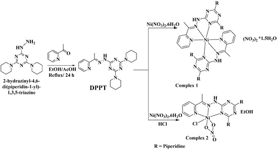 The organic ligand (DPPT) was synthesized by a reaction of 2-hydrazinyl-4,6-di(piperidin-1-yl)-1,3,5-triazine with 2-acetylpyridine in ethanol by heating under reflux conditions. The target hydrazone was obtained in high yield and with high purity and then used as it is for the preparation of the two Ni(II) complexes, as shown in Scheme 1. The Ni(II) complexes were obtained in a highly crystalline form via self-assembly of DPPT and Ni(NO3)2*6H2O in ethanol in the absence and presence of NiCl2*6H2O affording the monomeric complexes [Ni(DPPT)2](NO3)2*1.5H2O (1) and [Ni(DPPT)(NO3)Cl].EtOH (2), respectively, as shown in Scheme 1. Both complexes were air stable for a long time, and the crystal quality was not changed over time. Additionally, complexes 1 and 2 are soluble in polar protic solvents such as ethanol and methanol, as well as in polar aprotic solvents such as DMSO, DMF and acetonitrile. Their structures were confirmed using single-crystal X-ray crystallography (SCXRD).