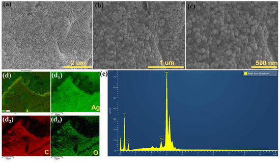 (a–c) FESEM images of biosynthesized AgNPs, (d–d3) elemental color mapping of biosynthesized AgNPs, and (e) EDX spectrum of biosynthesized AgNPs.