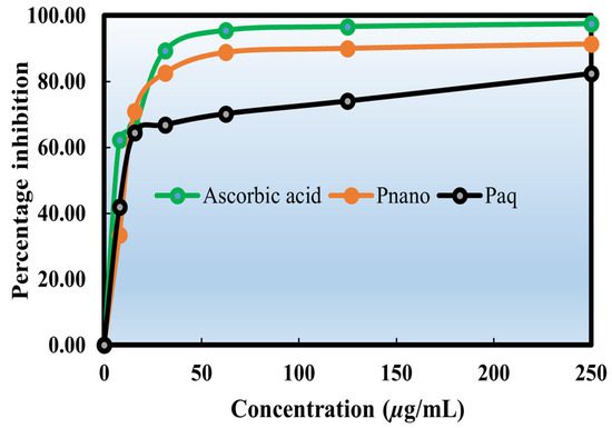 In our previous work, we reported a slightly higher antioxidant activity (13.85 ± 0.34 µg/mL) of AgNPs synthesized by using root extracts of Rubus ellipticus, in comparison to its aqueous extract (IC50 = 15.86 ± 4.14 µg/mL) [21]. In a similar study, the AgNPs synthesized by using Prosopis farcta fruit extract exhibited a comparable antioxidant activity to that of standard ascorbic acid [34]. The silver nanoparticles synthesized by using the leaf and bark extracts of Olea ferruginea Royle also exhibited higher antioxidant activities in comparison to their corresponding crude extracts [35].