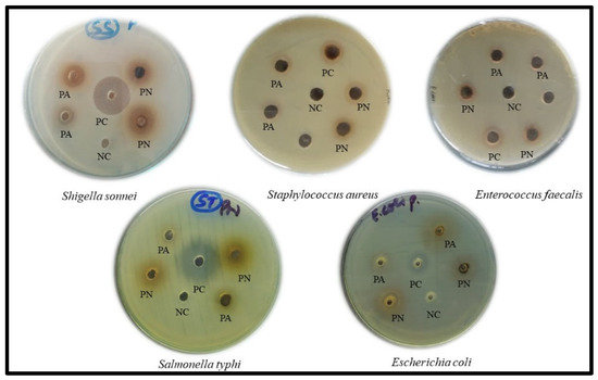 The antibacterial susceptibility of the green synthesized silver nanoparticles was evaluated by the agar well diffusion method [63,64]. The test was performed against both Gram-negative and Gram-positive bacteria (Table 5). The bacteria were cultured into the fresh Muller Hinton Broth (MHB) solution overnight at 37 °C to equalize the turbidity to that of 0.5 McFarland’s standard. The suspension was uniformly coated onto the surface of sterile Muller Hinton Agar (MHA) discs with sterile cotton swabs. Using a sterile cork-borer, 6 mm-diameter wells were punched on the MHA plates at equal spaces. The wells were filled with 50 µL of the AgNPs (1 mg/mL) in duplicates, along with a blank and neomycin as a positive control, and incubated for one day at 37 °C. On the next day, the discs were taken out, and the clear circles around the sample holes corresponding to the specific inhibition zones were measured and recorded.