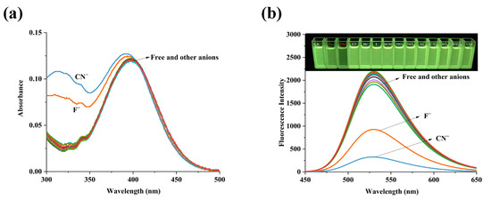 Effect of anions on UV-Vis (a) and fluorescence spectra (b) of TMN.
