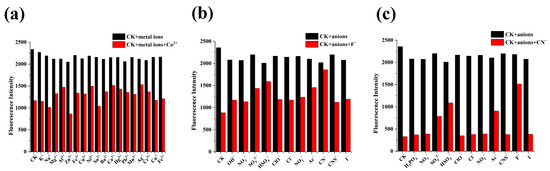 The interferences of other cations and anions on the recognition of Co2+, F−, and CN− by TMN (10−5 M) in MeCN solutions were also studied. Five eq. of different metal ions or anions were first added to the solutions of TMN, and then five eq. of Co2+, F−, and CN− were added after the solutions stood for a period of time. The fluorescence intensities of TMN with other metal ions were nearly unchanged while they were quenched in the presence of Co2+ (Figure 3a). F− was the same as Co2+ (Figure 3b). For CN−, the fluorescence intensity of TMN was almost unaffected by the addition of other anions, except for SO42−, HSO4−, and Ac−. Although these three ions interfered with it, their impact was relatively small and could be ignored (Figure 3c). Therefore, in the case of F− and CN− interfering with each other, there was almost no interference from other ions.