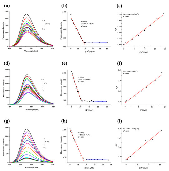 (a) Fluorescence spectra with different concentrations of ions, linear plots of fluorescence intensity, and ion concentrations and the Stern–Volmer plots. [Co2+]: (a–c); [F−]: (d–f); [CN−]: (g–i).