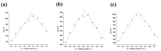The Job’s plot of TMN for Co2+ (a), F− (b), and CN− (c).