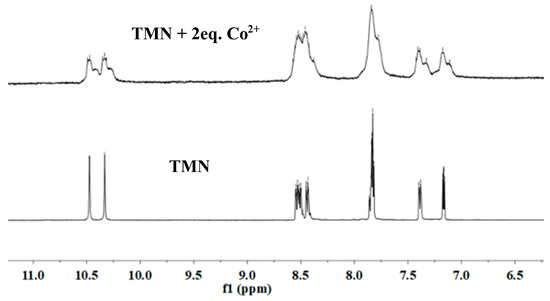 To further explore the mechanism of TMN for detecting Co2+, 1H NMR titration analysis was carried out in a DMSO-d6 solution. Due to the difference in the ligands and the electron arrangement of cobalt 3d7, Co(II) had a low-spin state, a high-spin state, and the coexistence of both, and low-spin Co(II) could be converted to low-spin Co3+ [43]. The two could be distinguished by 1H NMR spectra, with low-spin Co(II) complexes showing wide peaks and small paramagnetic shifts, high-spin Co(II) complexes showing narrow peaks and large paramagnetic shifts, and low-spin Co(III) complexes with diamagnetic and no paramagnetic shifts, so the Co(III) complexes in Figure 6 were in a low-spin state [44,45]. Since the chemical shift and number of protons of TMN were consistent with the 1H NMR spectra of the TMN, indicating that the active H of TMN had no interaction with Co2+, the mechanism of Co2+ detection may be that the two acyl groups of TMN were coordinated with Co2+, Co(II) was oxidized, and the reduced ligand changed its fluorescence spectrum [46,47,48] (Scheme 1).