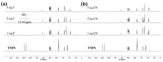 In Figure 7a, the two spikes at 10.2–10.5 ppm were two NH proton peaks, and with the addition of F−, both signals shifted to the upper field, where one moved to 9.6 ppm and disappeared after becoming wider and smaller, and the other one moved to the 9.1 ppm spike, and the appearance of the next small peak may be due to intramolecular hydrogen bonding [49]. The new peaks that appeared at 6.7–8.0 ppm may be due to the upper field displacement of aromatic CH [50]. Meanwhile, a new weak proton signal was found at 15.56 ppm, which confirmed the presence of the dimer, [HF2]− [51,52,53], implying deprotonation between the TMN and F−. In addition, a similar interaction mechanism between TMN and CN− was also investigated by 1H NMR titration experiments (Figure 7b). Different amounts (one to five eq.) of TBACN were sequentially added to the DMSO-d6 solution of TMN. When one eq. of CN− was added, the NH proton signal at 10.33 ppm immediately disappeared, and the other NH proton signal moved to the upper field site at 9.1 ppm, clearly indicating that deprotonation occurred [54,55]. Meanwhile, the addition of CN− destroyed the original molecular structure, and the proton peak that partially attached to the aryl group was displaced to the upward field, showing a new peak between 6.7 and 7.5 ppm [56]. The mechanism of TMN for F− or CN− is proposed in Scheme 2. Therefore, TMN could serve as a highly multifunctional fluorescent probe for the detection of Co2+, F−, and CN−.