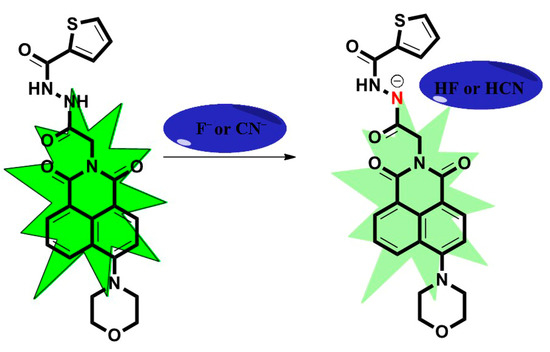 - Saini, N.; Wannasiri, C.; Chanmungkalakul, S.; Prigyai, N.; Ervithayasuporn, V.; Kiatkamjornwong, S. Furan/thiophene-based fluorescent hydrazones as fluoride and cyanide sensors. J. Photochem. Photobiol. A Chem. 2019, 385, 112038. [Google Scholar] [CrossRef]