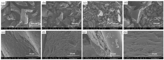 SEM images of the N- and O-codoped carbon materials: (a,e) C-600, (b,f) C-700, (c,g) C-800, and (d,h) C-900.