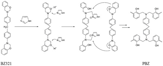 PBZ was prepared by the method developed in our previous work [42]. Briefly, 20 g benzoxazine powder was first mixed with 2 g imidazole. Afterward, 1.5 g Tween-80 and 4 g butanone were added into the system and stirred with a mechanical stirrer to form uniform mixture. Then, the reaction mixture was heated at 135 °C for 3 h for curing, affording about 18.56 g PBZ. The plausible mechanism for PBZ curing is shown in Figure 4.