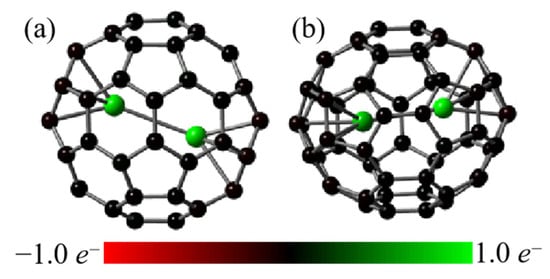 Figure 1 shows the optimized geometries of Lu2@C2v_C60 and Lu2@Ih_C60. The lowest frequencies for Lu2@C2v_C60 and Lu2@Ih_C60 are calculated to be 36 and 45 cm−1, respectively, suggesting their possible existence, as shown in Figures S1 and S2. The single-point energy calculations showed that the Lu2@C2v_C60 possessed energy of 5.3 kcal·mol−1 higher than the energy of Lu2@Ih_C60, of which results are confirmed by the hybrid functional PBE0 (PBE0/6-311G(d,p)~SDD//PBE0/6-31G(d)~CEP-4G) showing Lu2@C2v_C60 with energy of 0.7 kcal·mol−1 higher than the energy of Lu2@Ih_C60.