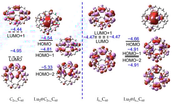 Furthermore, the FMOs have been mapped as shown in Figure 3, in which the C60 fullerenes based on single-point calculations are obtained from the optimized Lu2@Ih_C60 and Lu2@C2v_C60. The highest occupied molecular orbitals (HOMOs) of Lu2@C60 are contributed by the Lu2 dimer, presenting the Lu-Lu bond. It is clear that the LUMO and LUMO + 1 of the C60 fullerenes become the HOMO-1 and HOMO-2 of the Lu2@C60 indicating the four-electron transfer from inner moiety to fullerene cage, and this result is in line with the natural bond order analysis again confirming the electronic configuration of (Lu2)4+@(C60)4−. This electronic configuration has been verified in the previous report on Lu2@C2n (2n ≥ 76) [17,18,19,22]. Additionally, the t1u LUMO has been split after encapsulation of Lu2 dimer. As shown in Figure 3, after encapsulation of Lu2 dimer in Ih-C60, its energy level of LUMO + 1 and LUMO is equal, but the energy level of LUMO + 2 is −4.22 eV. This is derived from the distortion of C60 fullerene. The symmetry of Ih-C60 and C2v-C60 have reduced to D3d and C1, respectively, after encapsulation, and the calculated distortion energies of Ih-C60 and C2v-C60 are 35.4 and 29.6 kcal·mol−1, respectively, on the theoretical level of PBE/6-311G(d,p)~SDD.