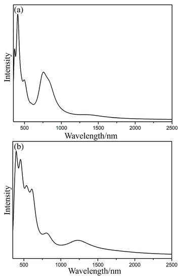 Simulated vis-NIR spectra of the Lu2@Ih_C60 (a) and Lu2@C2v_C60 (b) isomers. The broadening function is Lorentzian and full width at half maximum is 0.30 eV.
