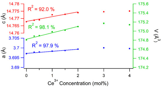 All Ca1−xCexCN2 (x = 0, 0.003, 0.005, 0.01, 0.015, 0.02, 0.03 and 0.04) samples were identified by the X-ray powder diffraction technique (XRD). As shown in Figure 1, all compounds can be unambiguously indexed as rhombohedral phase (space group , COD card no. 153-9974). Nonetheless, additional low-intensity lines indicate the presence of cerium oxycarbodiimide Ce2O2CN2 (space group , JCPDS no. 049-1164) as a secondary phase for the sample with Ce3+ content greater than 2 mol%, as evidenced by the presence of lines (001), (101) and (102) located at 10.57°, 28.00° and 33.61°, respectively (zoom Figure 1). Rietveld refinement analyses were conducted on the as-prepared samples to verify the impact of cerium doping on the crystal lattice. The Rietveld refinement result for CaCN2:0.5%Ce as well as details of the structural parameters and the atomic parameters are given in Figure S2 and Tables S1 and S2. The evolution of the a and c unit cell parameters as well as the cell volume versus the Ce3+ doping concentration are presented in Figure 2. Despite similar ionic radii between the Ca2+ and Ce3+ ions in 6-fold coordination, i.e., = 1.00 Å and = 1.01 Å [24], a slight increase in the cell parameters can be observed up to 2 mol% (Ce). The lattice parameters then remain more or less constant up to 4 mol% (Ce) due to the formation of Ce2O2CN2 as a secondary phase indicating that the solubility limit of Ce3+ within the CaCN2 matrix is quite limited. One reason can be the formal charge difference between the substituted cation Ca2+ and the dopant cation Ce3+, resulting in local distortions and/or the creation of defects to maintain the overall electroneutrality of the crystal lattice, such as cationic vacancies according to the equation: 3 Ca2+ → 2 Ce3+ + VCa.