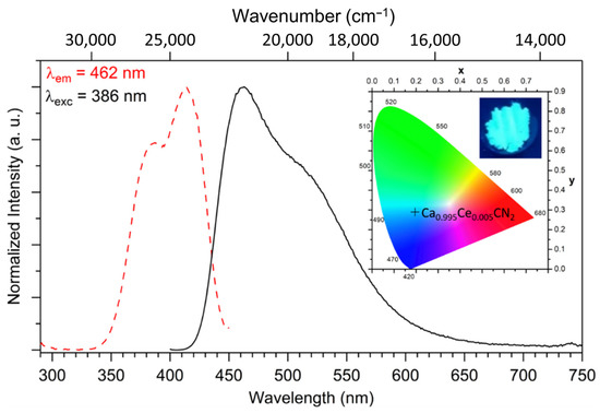 The normalized photoluminescence excitation (PLE) and emission (PL) spectra of the Ca0.995Ce0.005CN2 sample at room temperature, as well as Commission Internationale de l’Éclairage (CIE) coordinates and a picture of the emitting phosphor under 365 nm UV lamp illumination are presented in Figure 5. When monitored with emission wavelength at 462 nm, the PLE spectrum shows a partially overlapping double band with maxima at 384 and 414 nm, respectively. These bands, which extend over a wavelength range from 350 to 450 nm are characteristic of the 4f → 5d transitions of Ce3+ ion [26,27], in good agreement with the absorption bands observed on the diffuse reflection spectra. Under excitation at 386 nm, the emission spectrum of the sample consists of a broad asymmetric emission band from 400 to 650 nm whose maxima were estimated at 462 nm (main peak) and 510 nm by using a Gaussian fit which allows the deconvolution of the double band into two contributions (Figure S3). This gap of 48 nm (i.e., approximately 2040 cm−1 on an energy scale) between these two maxima is of the same order of magnitude as the theoretical value of 2000 cm−1 expected between the two 4f sublevels of trivalent cerium, and thus the double band can be ascribed to the 5d1 → 2F5/2 and 5d1 → 2F7/2 transitions [28]. The presence of a unique double band related to the cerium emission also indicates that the Ce3+ ion occupies only one site within the lattice, namely, the octahedrally coordinated Ca2+ site of the investigated host lattice. Such cyan emission is in good agreement with those already observed in sulfide and oxide matrices such as SrS:Ce3+, CaS:Ce3+ and CaO:Ce3+ where the Ce3+ ion is located at the octahedral site [29,30]. The CIE chromaticity coordinates are (x = 0.19, y = 0.29).