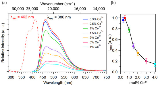 (a) PL spectra at room temperature of CaCN2:Ce samples. (b) Maximum emission intensity (Imax) vs. mol% (Ce) for CaCN2:Ce. Uncertainty bars = ±0.05.