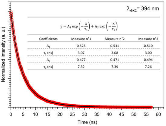 where I is the luminescence intensity, A1 and A2 are constants, t is the time, and τ1 and τ2 are the decay constant for the exponential component. The average decay time is calculated with the following formula [34,35],