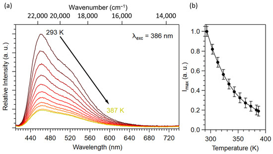 (a) PL spectra (λexc = 386 nm) of Ca0.995Ce0.005CN2 at variable temperature (293–387 K). (b) Maximum emission intensity (Imax) vs. temperature (293–387 K) for Ca0.995Ce0.005CN2. Uncertainty bars = ±0.05.