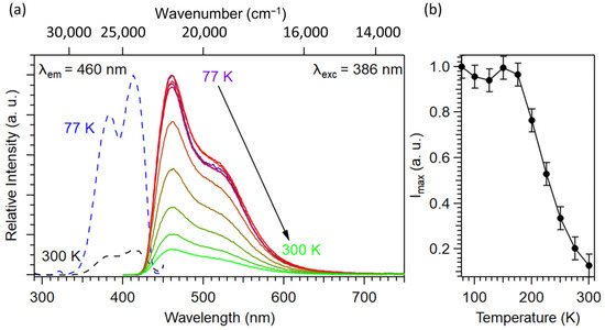 (a) PL spectra (λexc = 386 nm) of Ca0.995Ce0.005CN2 at low temperature (77–300 K). (b) Maximum emission intensity (Imax) vs. temperature (77–300 K) for Ca0.995Ce0.005CN2. Uncertainty bars = ±0.05.