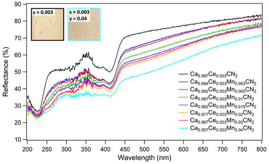 Diffuse reflection spectra of Ca0.997Ce0.003CN2 and Ca0.997−yCe0.003MnyCN2 (0.003 ≤ y ≤ 0.04) samples at room temperature. In inset: Appearance of Ca0.997Ce0.003CN2 and Ca0.957Ce0.003Mn0.04CN2 powders in daylight.