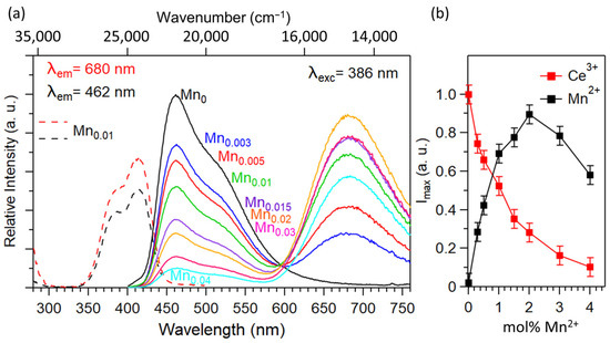 The photoluminescence properties of the Ce3+/Mn2+ co-doped samples were then studied. The obtained photoluminescence spectra are shown in Figure 11a. The excitation spectra of the Ca0.987Ce0.003Mn0.01CN2 sample were recorded by fixing the emission wavelength at 462 nm and 680 nm, respectively, while the normalized emission spectra of the whole series were recorded at 386 nm. The evolution of luminescence intensity as a function of manganese concentration is presented in Figure 11b. By monitoring the emission at 680 nm, the PLE spectrum of Ca0.987Ce0.003Mn0.01CN2 shows two excitation bands. The first one, located around 270 nm, is attributed to the absorption of the host lattice as already discussed in our previous study on Mn2+-doped CaCN2 [20]. The second, consisting of a partially overlapping double band between 350 and 450 nm, corresponds to the 4f → 5d transitions of the cerium ion by analogy to the results obtained on the series of Ce3+-doped CaCN2 samples (see Figure 5). The presence of this absorption band on the excitation spectrum for the emission centered at 680 nm supports the occurrence of energy transfers from Ce3+ ions to Mn2+ ions, as single-doped CaCN2:Mn2+ exhibits such emission at 680 nm only when excited through the host lattice at high energy, i.e., λ ≤ 270 nm [20]. Under excitation at 386 nm, the emission spectrum of Ca0.987Ce0.003Mn0.01CN2 (green line) shows the characteristic emission bands of both Ce3+ and Mn2+ ions. The first emission band located between 400 and 580 nm is the double band associated with the 5d1 → 2F5/2 and 5d1 → 2F7/2 transitions of Ce3+ while the second one centered at approximately 680 nm corresponds to the 4T1g(4G) → 6A1g(6S) transitions of Mn2+ [20].