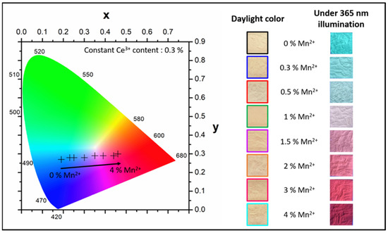 To quantify the optical characteristics of phosphors and to evaluate the impact of Mn2+ co-doping on the generated color, the chromaticity coordinates (x, y) of prepared materials have been determined. Numerical results are listed in Table S5, whereas the CIE chromaticity diagram as well as a picture of the emitting phosphors under 365 nm UV lamp exposure are presented in Figure 12. The chromaticity coordinates of the series of samples show that a color gradient is obtained, varying from cyan (y = 0, 0.003 and 0.005) to red (y = 0.03 and 0.04) through a shade of white (y = 0.01), as a function of the increase in manganese rate.