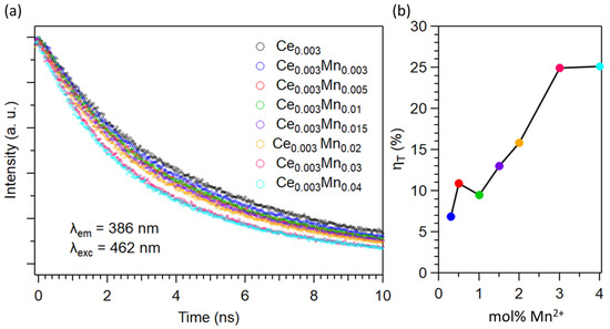 In order to further investigate the efficiency (ηT) of the energy transfers (ET) from Ce3+ to Mn2+, the lifetime and the ET efficiency are calculated from the decay curves of Ca0.997−yCe0.003MnyCN2 (0.003 ≤ y ≤ 0.04)-doped samples monitored at 394 nm (Figure 13). The decay curves can be well fitted by a bi-exponential function, owing to the splitting of the 4f ground state of Ce3+, 2F5/2 and 2F7/2 levels [34,35],