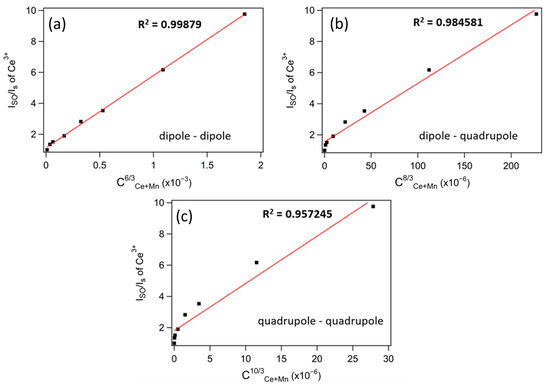 Dependence of IS0/IS of Ce3+ on (a) C6/3, (b) C8/3 and (c) C10/3.