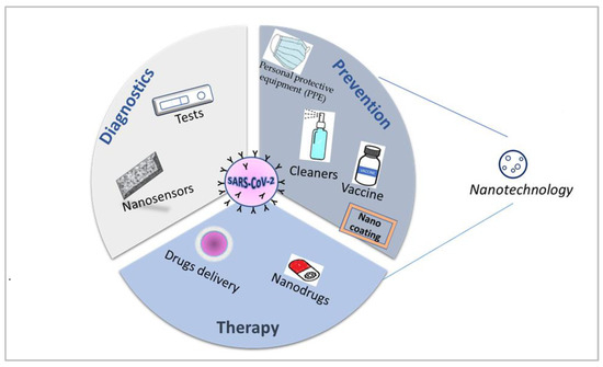 Nanotechnology can provide promising solutions in the fight against the SARS-CoV-2 virus, thanks to the precious peculiarities of the nanoparticles involved such as a high surface-to-volume ratio, easy surface modification, high physic-chemical stability, optical properties specifications, and targeted and controlled release capabilities [36,37,38]. The potential of nanotechnologies toward SARS-CoV-2 is currently established in prevention, diagnosis, and therapy [39,40] (Figure 1).